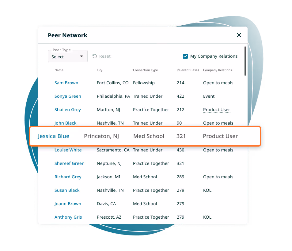 Our platform has two more powerful tools here to assist with event prep. Peer Networks provides HCP details such as education, residency, co-practice, and co-publications. This information is incredibly useful for facilitating conversations on the floor or in the booth. Just showing a provider that you know a little bit about them prior to meeting immediately captures their interest.