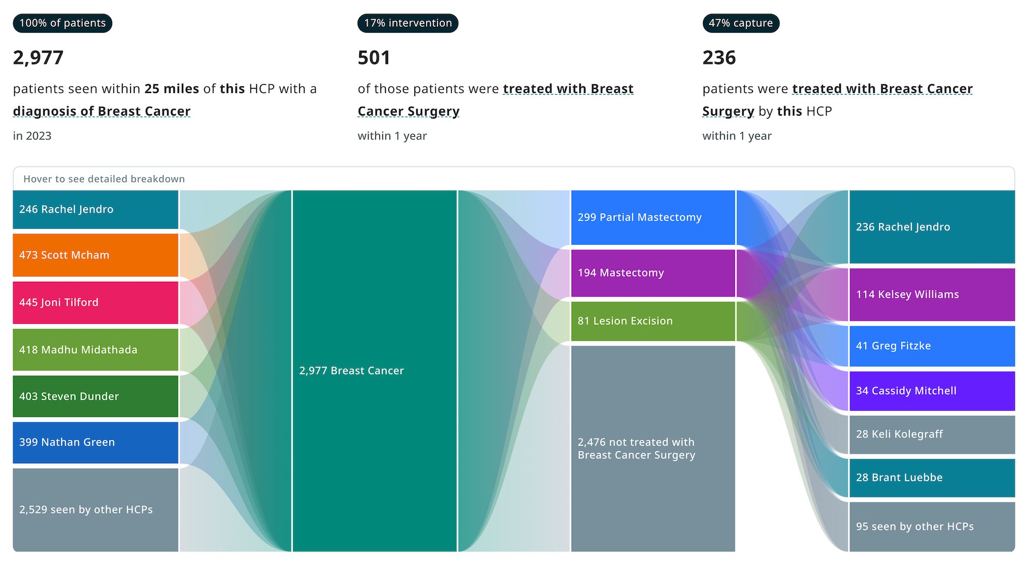 Additionally, reps can use Referral Pathways to show healthcare executives how they can help drive ROI by reducing patient leakage. With the ability to visualize upstream and downstream referrals between providers, healthcare executives can see where patients are leaving their systems. Providers who don’t meet benchmarks for in-network referrals can be prioritized for educational events about the benefits of your technology.