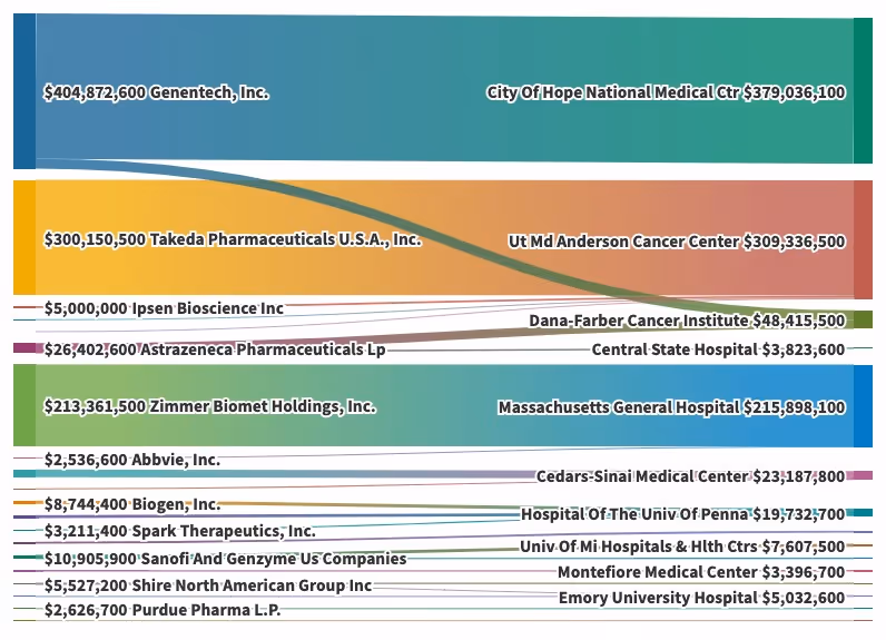 The following chart shows which teaching hospitals received the most from the highest-spending medical device and pharmaceutical companies in 2019. One takeaway from this image is the degree to which companies focus their financial relationships on a single teaching hospital. For example, Genetech spent over $400 million in payments to teaching hospitals in 2019, of which $379 million—the vast majority—went to the City of Hope National Medical Center in California.