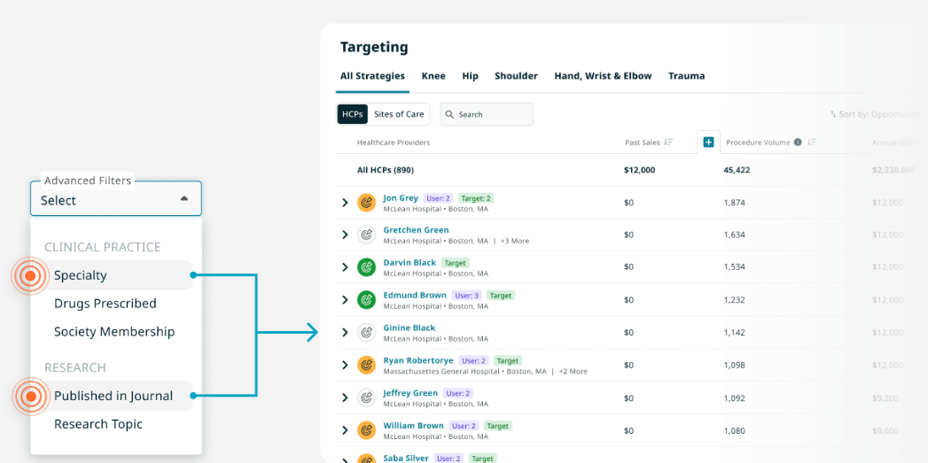 Within our Targeting solution, you can filter healthcare providers by speciality, then create additional filters for the attributes you want your KOL roster to include, such as society memberships, research papers by publication or topic, or educational background.