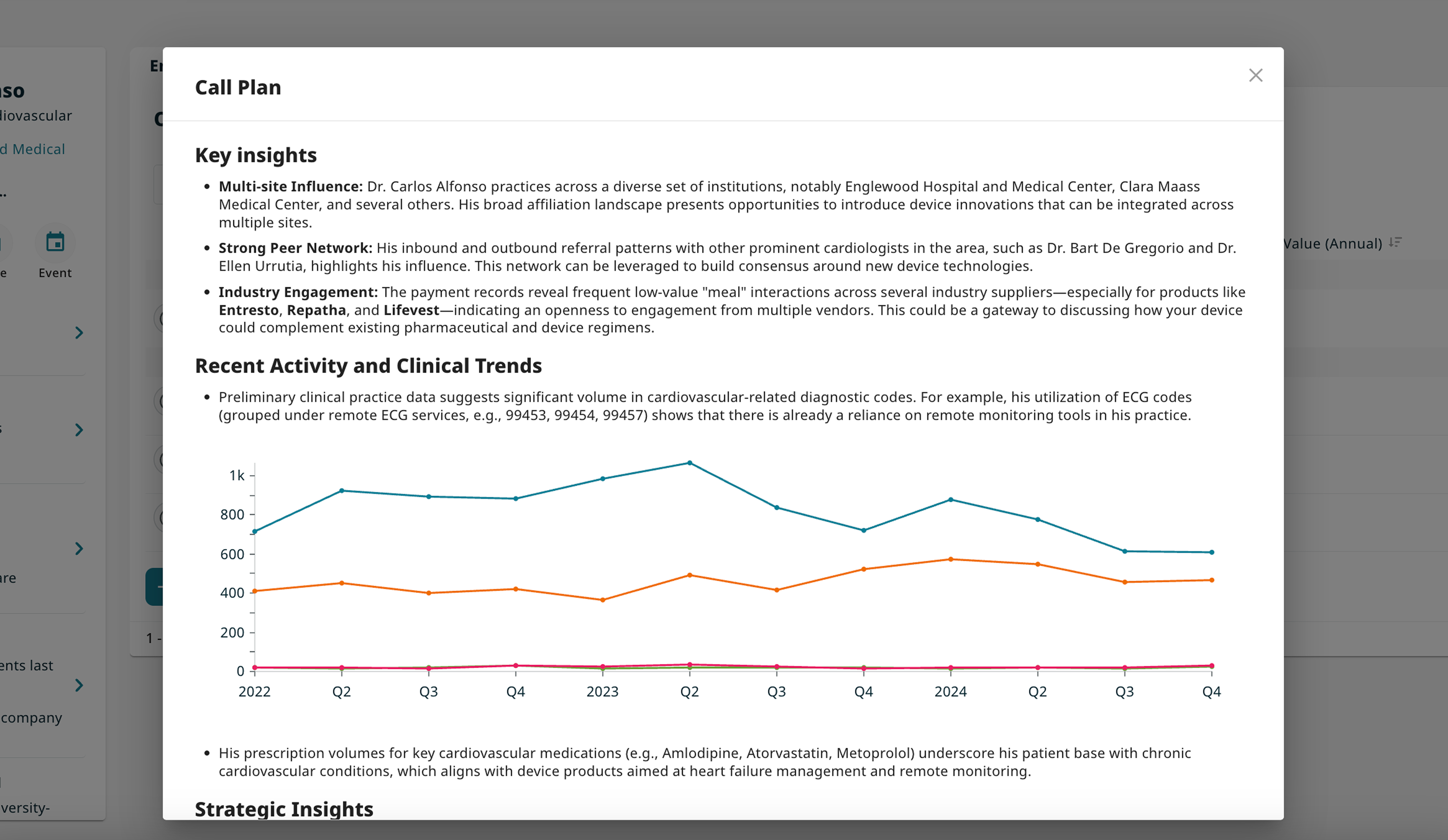 - Conversation starters based on an HCP’s professional history, peer network, or recent changes to their practice