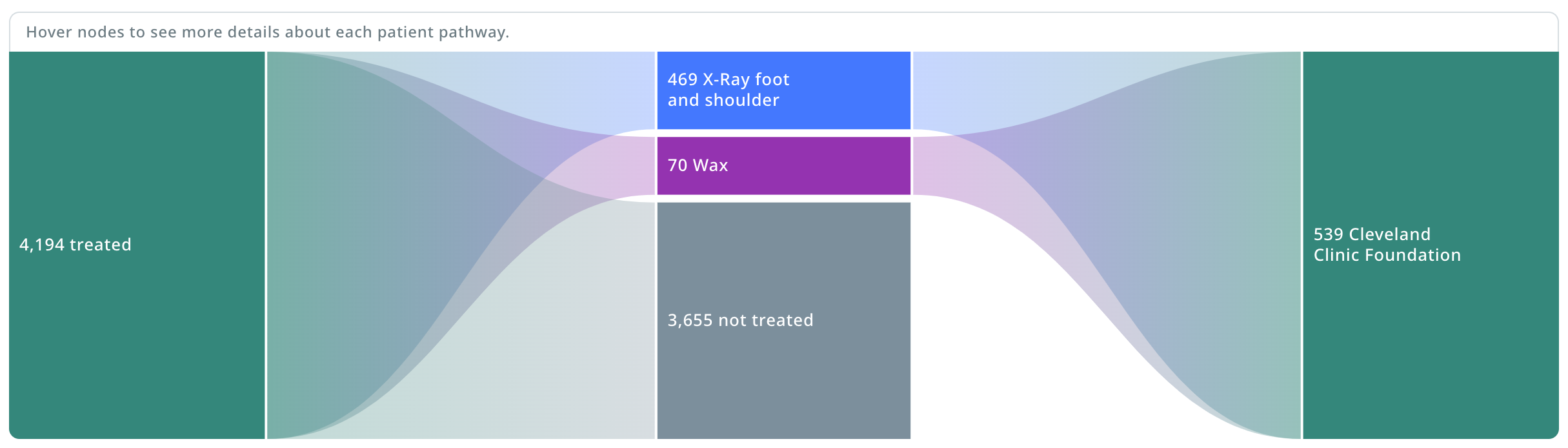 The designer considered a Sankey diagram to visualize patient flow. But it wasn’t quite a perfect fit for representing complex healthcare journeys. As Megan explained, “Sankey diagrams are great for representing something like financial data. If you start with $1,000, you can easily show where that money goes - you can’t spend a single dollar on two things. But patients can get two treatments for one diagnosis. They can get 10 treatments for one diagnosis by eight providers at four different sites of care. It’s significantly more complicated.”